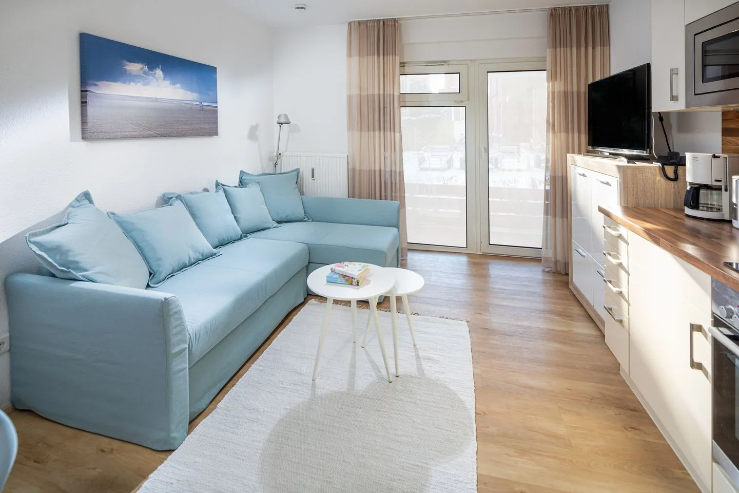 Die Ferienwohnung besticht durch ihre moderne und praktische Ausstattung. Ein gemütliches Schlafzimmer mit Boxspringbett und ein stilvolles Wohnzimmer mit einem komfortablen Sofa, welches als Schlafmöglichkeit für 2 weitere Personen genutzt werden kann. Die offene Küche ist voll ausgestattet. Hier finden Sie alles, was Sie für die Zubereitung leckerer Urlaubsmahlzeiten benötigen — von Herd, Backofen, Geschirrspüler bis hin zu Kaffeemaschine und Mikrowelle. Ein Esstisch bietet genügend Platz für gesellige Abendessen. Die Einheit ist zusätzlich allergikergeeignet und somit ideal für jeden Gast.
