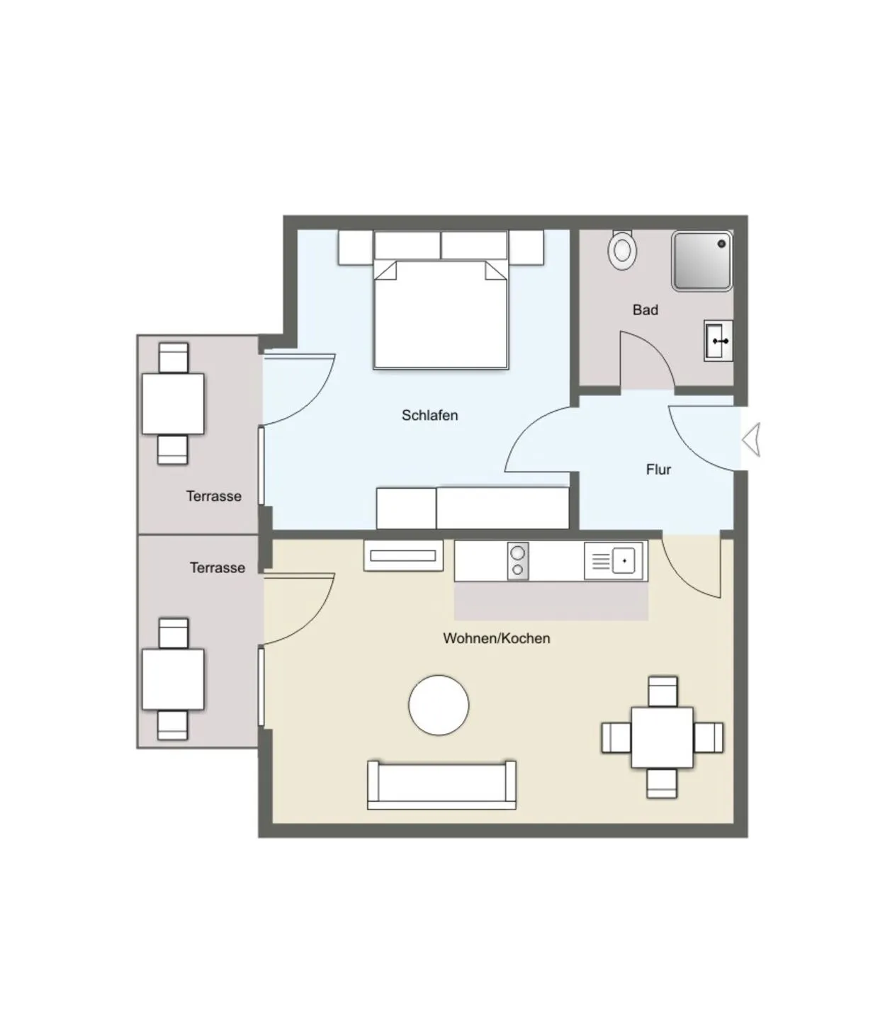 Ein besonderes Highlight der Unterkunft ist die Terrasse, die mit Gartenmöbeln ausgestattet ist und einen schönen Blick in den Garten bietet. Diese ist der perfekte Ort, um den Tag mit einem Frühstück im Freien zu beginnen oder bei einem Glas Wein den Sonnenuntergang zu genießen. Die Terrasse ist vom Schlafzimmer und vom Wohnzimmer erreichbar.