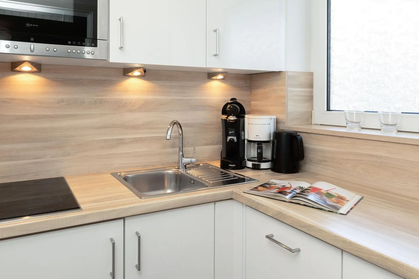 Die Wohnung ist durchdacht und modern eingerichtet. Sie verfügt über ein Schlafzimmer, ein Gäste-WC und ein Badezimmer mit einer Dusche. Die offene Küche, die direkt zum Ess- und Wohnzimmer übergeht, ist vollständig ausgestattet. Hier finden Sie einen Herd mit zwei Platten, eine Mikrowelle, einen Kühlschrank mit Gefrierfach, eine Spülmaschine und eine Kaffeemaschine – alles, was Sie benötigen, um köstliche Mahlzeiten zuzubereiten oder einfach nur einen schnellen Snack zu genießen. Der Esstisch und das Sofa laden zum Verweilen und gemeinsamen Spielen ein.