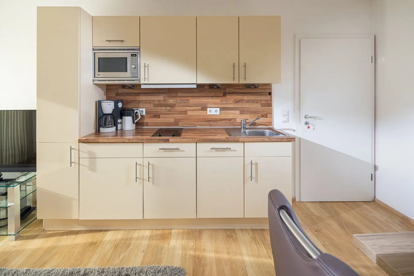 Die Wohnung befindet sich im ersten Stock des Appartement Haus Bracht und ist bequem mit dem Aufzug zu erreichen. Sie umfasst ein gemütliches Schlafzimmer mit Boxpringbett sowie ein Schlafsofa im Wohn-Essbereich. In der Küche finden Sie alle notwendigen Geräte wie Herd, Spülmaschine, Mikrowelle, Kühlschrank mit Gefrierfach, sowie eine Kaffeemaschine und einen Toaster. So sind Sie bestens für entspannte Kochabende ausgestattet! Der Essbereich mit einem großen Esstisch lädt zum gemeinsamen Essen und Verweilen ein.