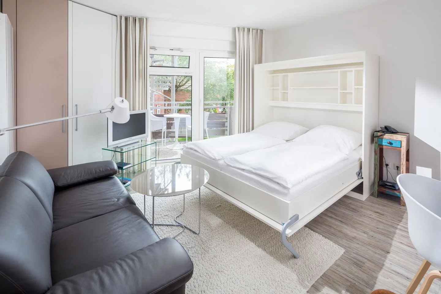 Die Wohnung verfügt über ein Schrankbett,welches tagsüber hochgeklappt werden kann. So haben sie Platz nach einem langen Tag am Strand zu entspannen und Ihre Mahlzeiten in der gut ausgestatteten Küche zuzubereiten. Diese ist mit einem Herd, Kühlschran, Wasserkocher, Toaster und einer Kaffeemaschine ausgestattet.