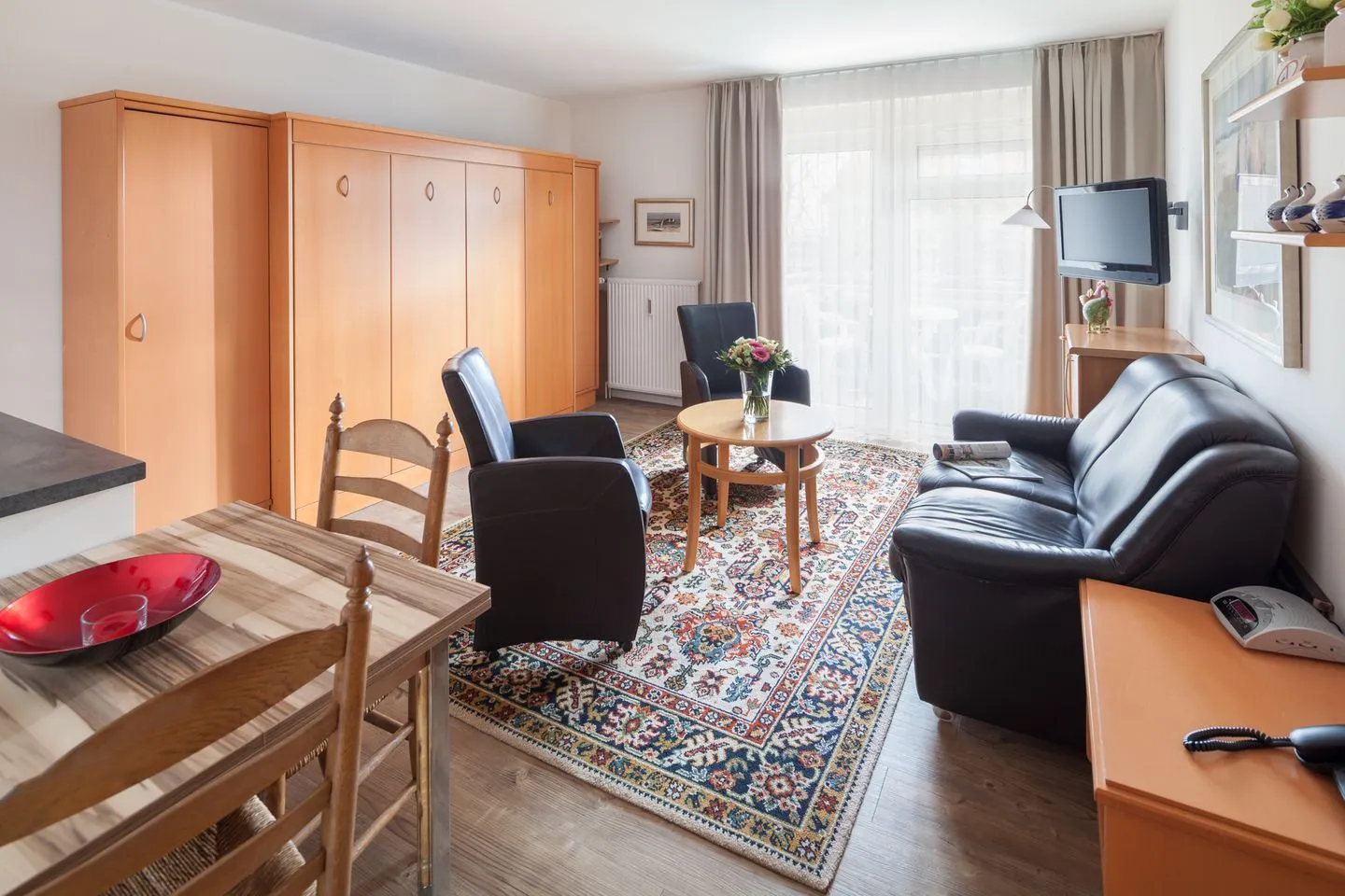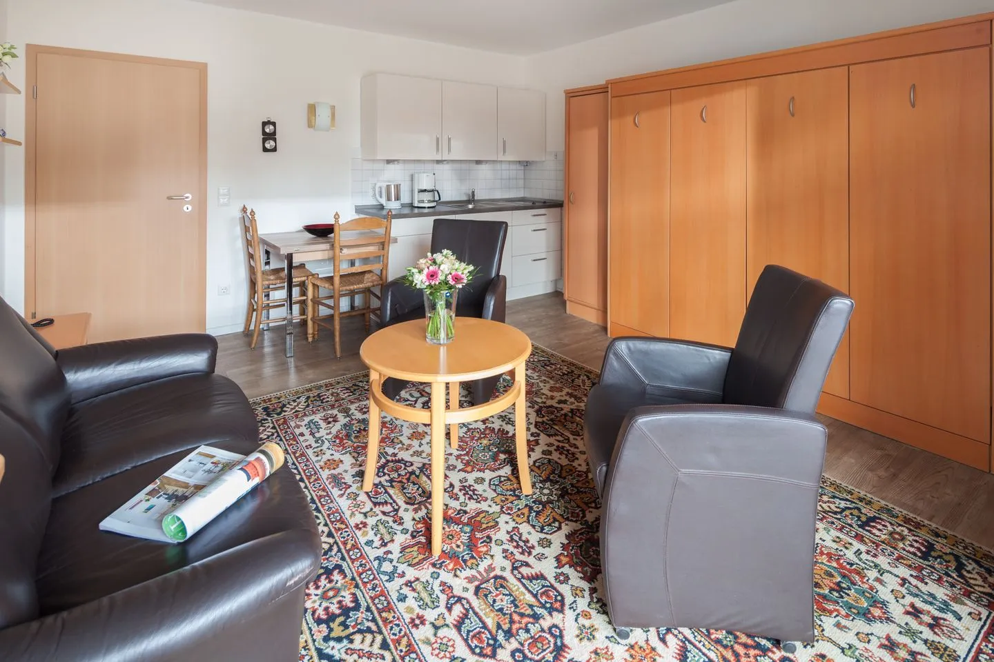 Das Appartement verfügt über ein Schrankbett, eine Sofaecke mit einem TV, ein Essbereich sowie eine offene, gut ausgestattete Küche. Hier können Sie bei einer Tasse Kaffee oder einem gemeinsamen Abendessen die Seele baumeln lassen. Die Küche ist mit einem 2-Platten-Herd, Kühlschrank mit integriertem Gefrierfach, Kaffeemaschine, Wasserkocher und den nötigen Küchenutensilien ausgestattet, sodass Ihren Kochkünsten keine Grenzen gesetzt sind.