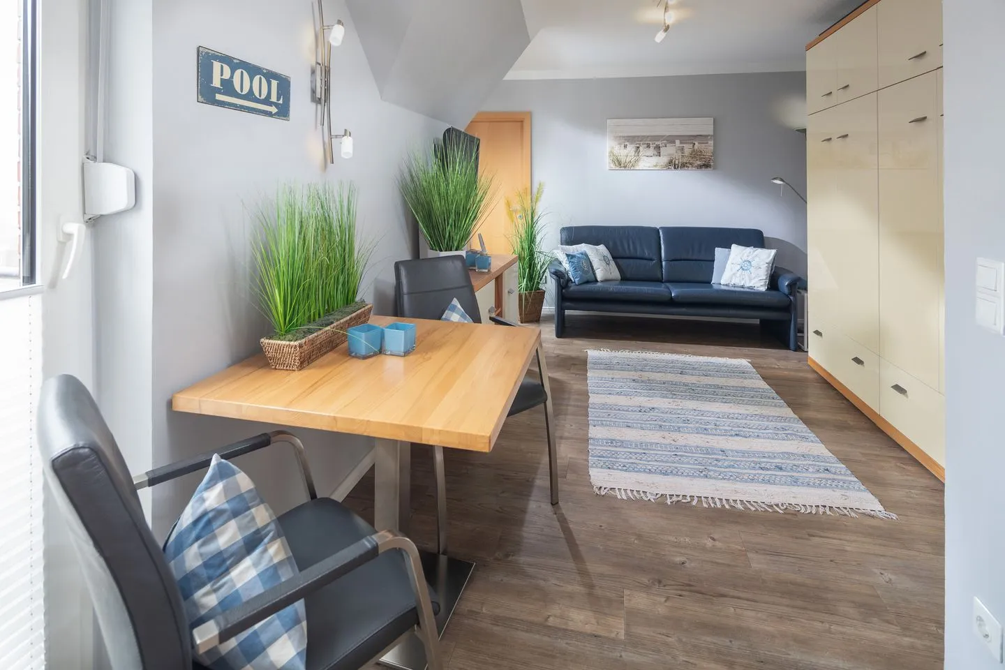im Zimmer befindet sich ein Schrankbett, ein Sofa und ein Essbereich. Die Kochnische ist mit allem ausgestattet, was Sie für die Zubereitung Ihrer Mahlzeiten benötigen, darunter ein Herd, ein Kühlschrank mit Gefrierfach, eine Spülmaschine sowie diverse Küchengeräte wie Mikrowelle, Toaster und Kaffeemaschine.