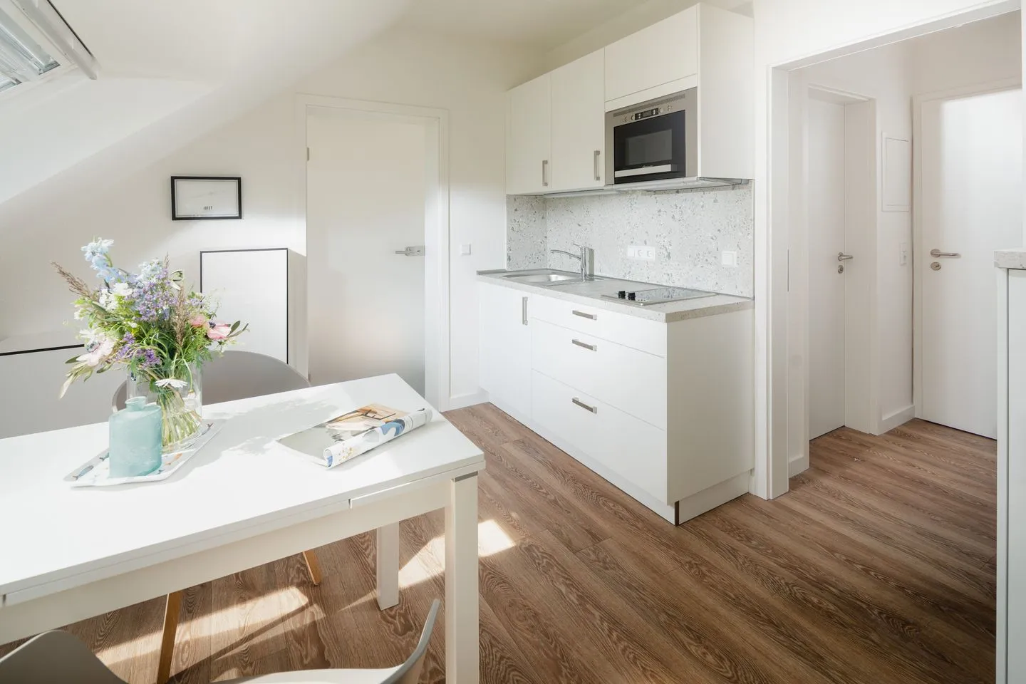 Mit einer hervorragenden Lage in der Wilhelmstraße 53, nur 400 Meter vom traumhaften Sandstrand entfernt, erleben Sie hier unmittelbare Nähe zur Natur, während die Stadt und ihre zahlreichen Annehmlichkeiten praktisch vor der Tür liegen. Diese modern gestaltete 32 m² große Unterkunft im vierten Stock ist der optimale Ort für unvergessliche Urlaubstage.
