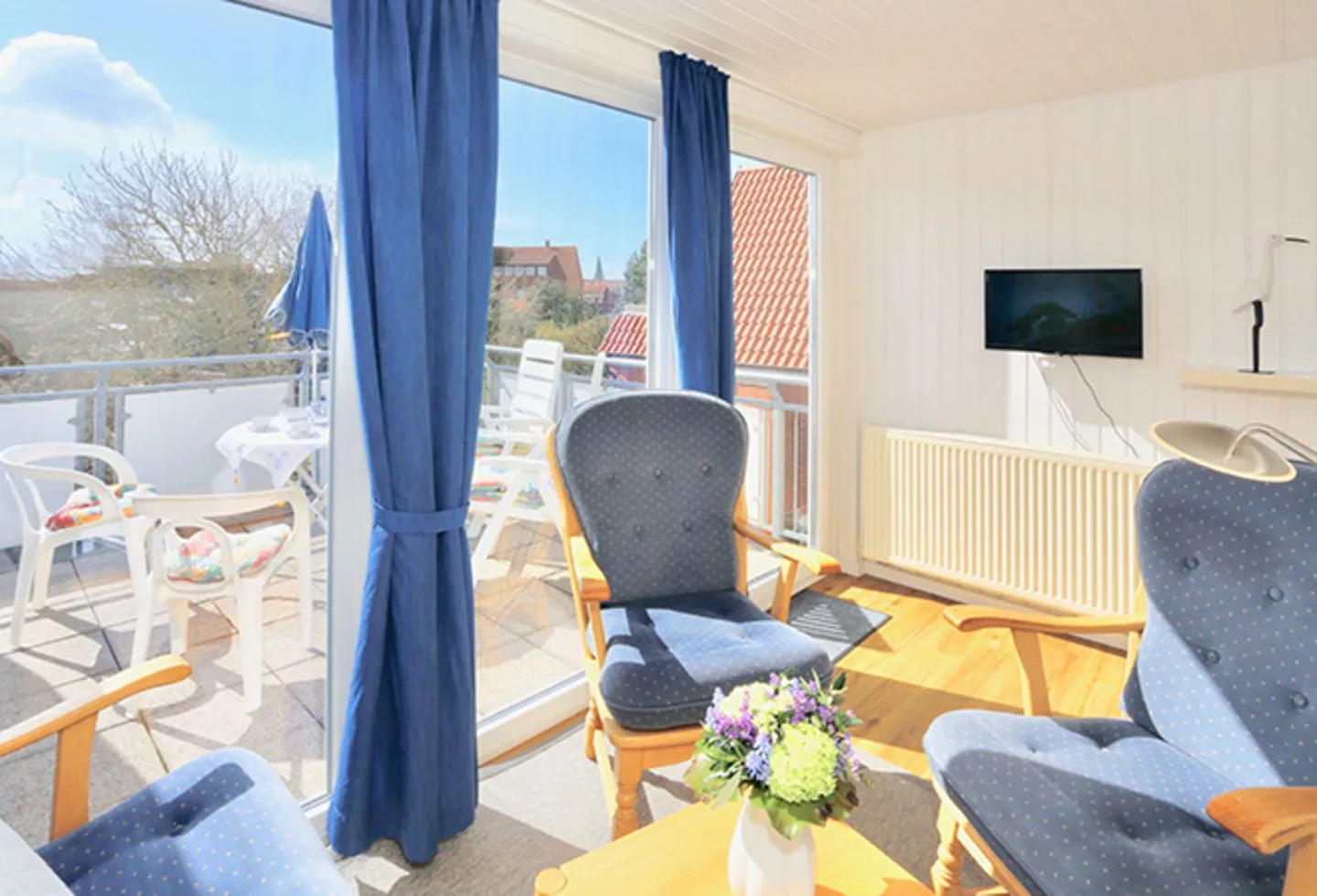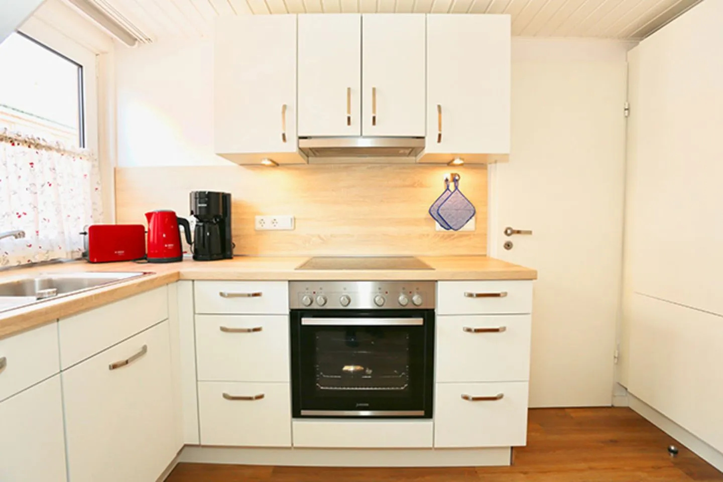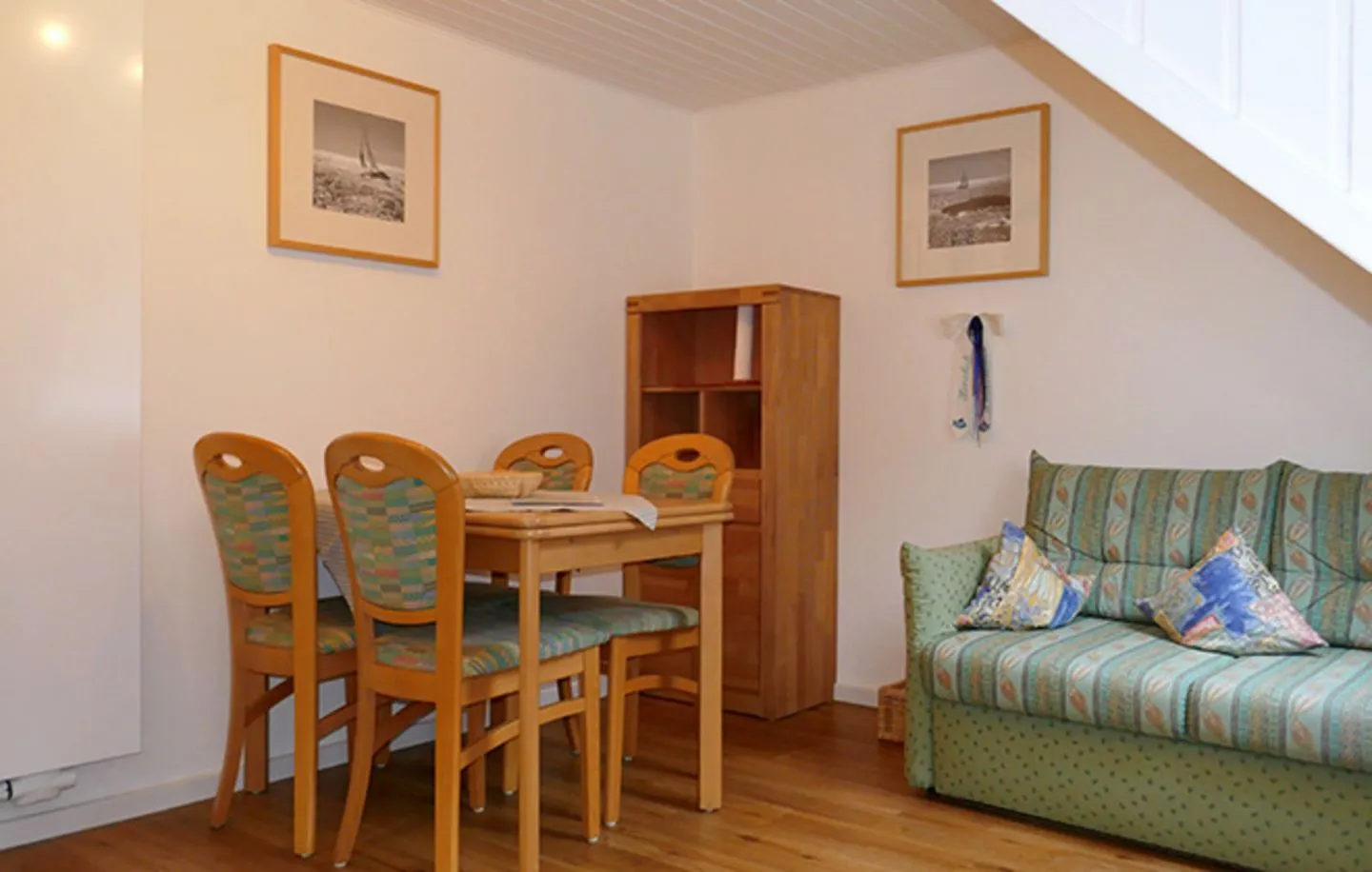 Der Wohnbereich dieser Wohnung ist größer, als es die 45 qm vermuten lassen. Denn die Flächen unter den Dachschrägen zählen nicht mit, sorgen aber zusätzlich für Raum – und für Behaglichkeit. Auch diese Wohnung ist sehr zweckmäßig gegliedert. Der gemütliche Wohnbereich und die große Wohnküche mit Essraum sind hier getrennt. Beide sind komplett ausgestattet mit Kabelfernsehen/Radio (auch gute Bücher fehlen nicht) bzw. mit allen wichtigen Küchen-Accessoires. In der Küche besteht eine weitere Schlafmöglichkeit, hierfür steht eine Klappcouch zur Verfügung. Das Bad verfügt über Dusche und WC. Diese Wohnung ist bei unseren Gästen besonders wegen ihrer 'Wohlfühl-Atmosphäre' und des schönen Blickes ins Grüne und über die Dächer der Ortschaft beliebt. Hinter den großen Fensterflächen liegt der Balkon Richtung Süden, der nicht nur besonders großzügig ausgelegt ist, sondern durch seine quadratische Grundfläche auch sehr vielseitig genutzt werden kann.