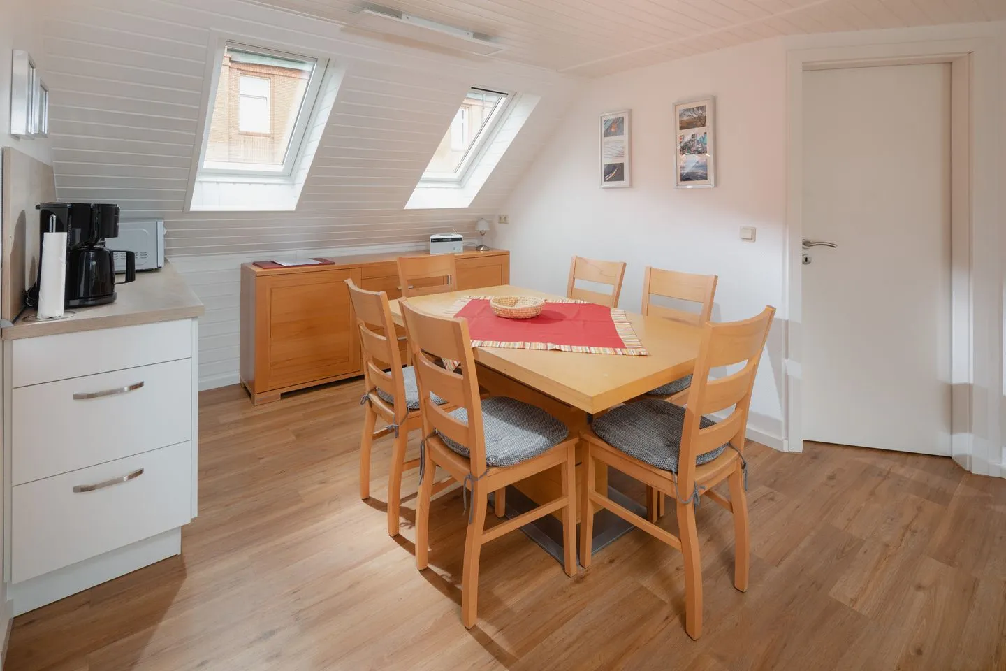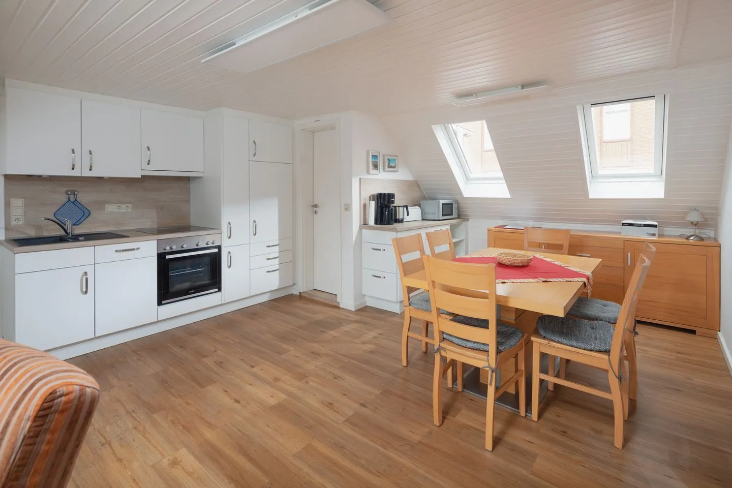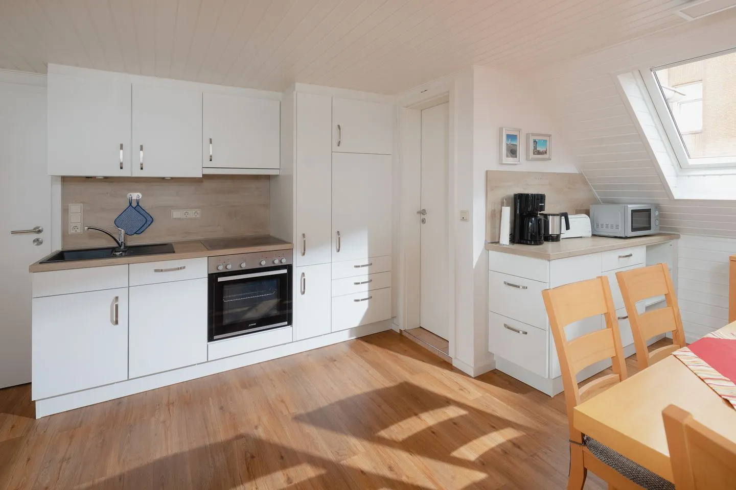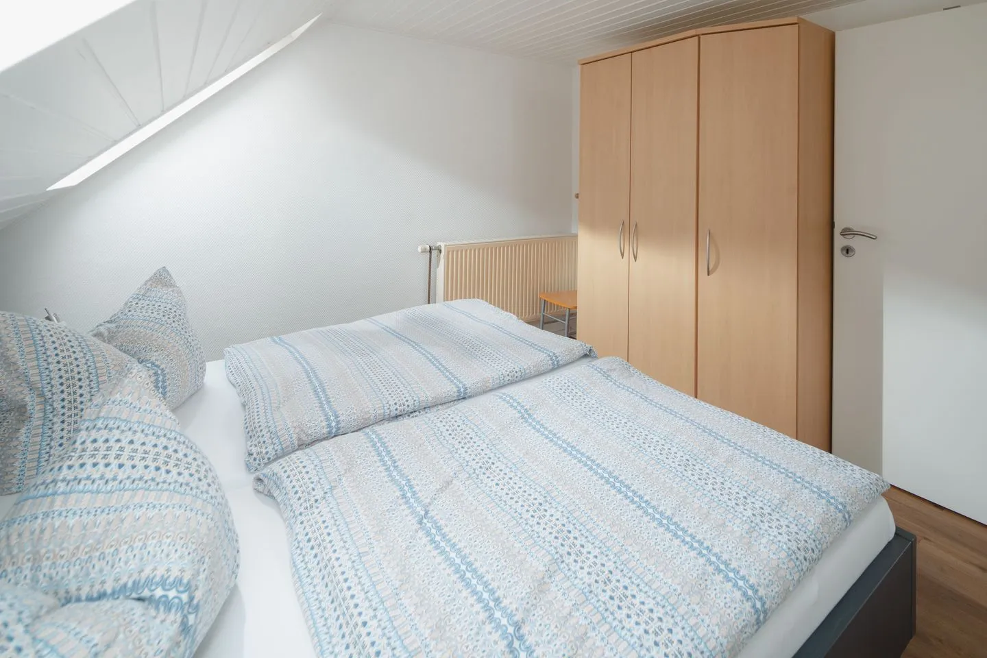 Die „Alte Schmiede“ bietet mit ihrer über 60 qm großen Wohnung Nummer 6 sehr großzügige Räumlichkeiten. Bis zu vier Personen genießen hier ein ausgesprochenes Wohlfühl-Ambiente, zu dem auch der sehr große Balkon beiträgt. Dieser ist natürlich durch den Wohnbereich zu erreichen, aber auch separat durch das zweite Schlafzimmer. Küche und Wohnbereich sind in der Wohnung 6 in einem Bereich, allerdings räumlich distanziert, arrangiert. So bleibt man in Verbindung, und doch wirkt jeder Funktionsbereich eigenständig. Das Bad verfügt über Dusche und WC. Die komplette Ausstattung aller Zimmer sei hier nur der Vollständigkeit halber erwähnt.