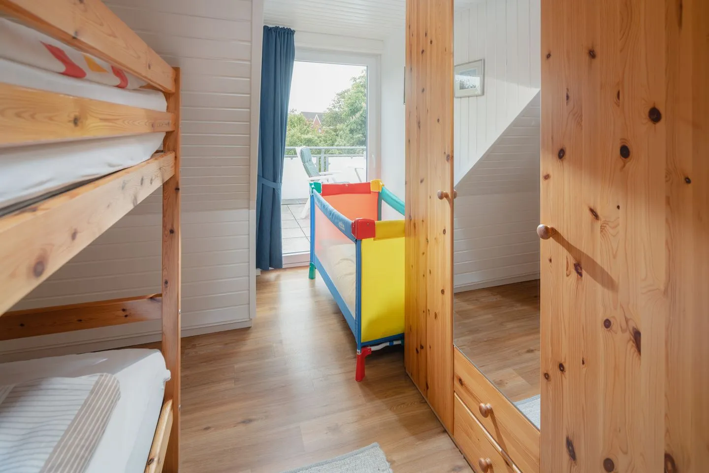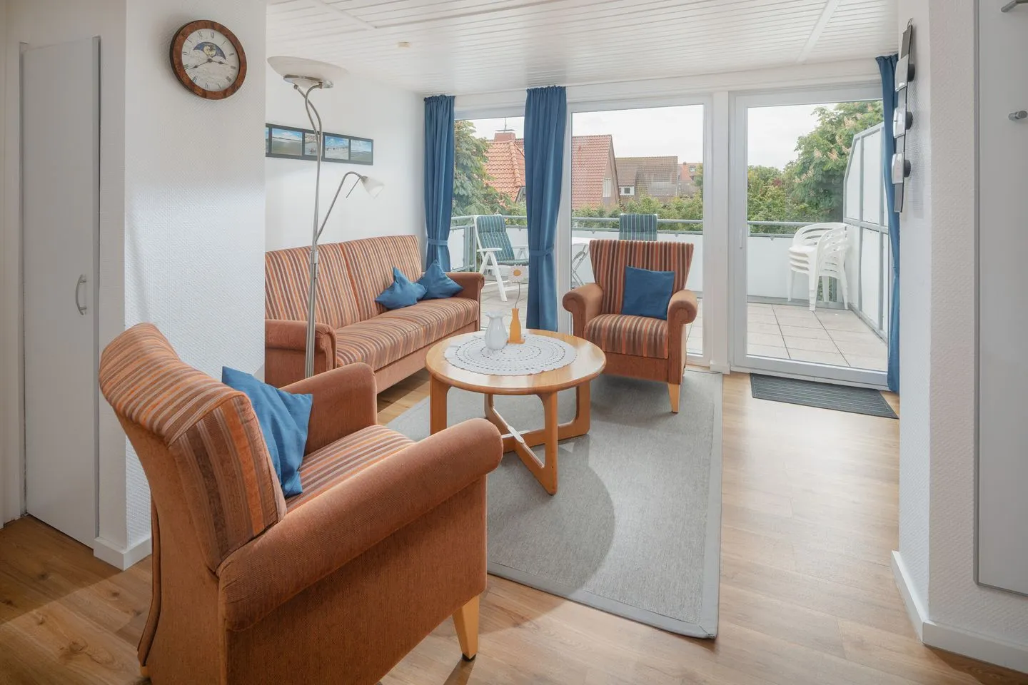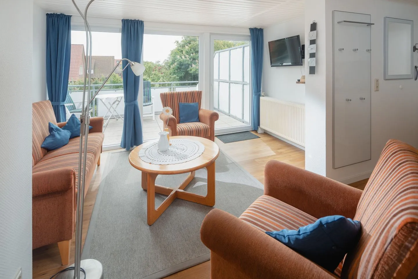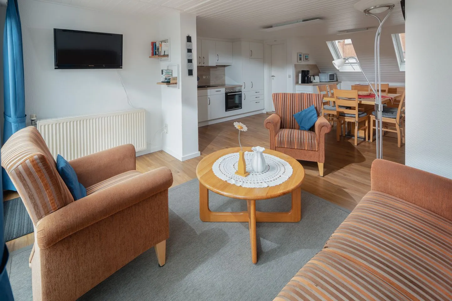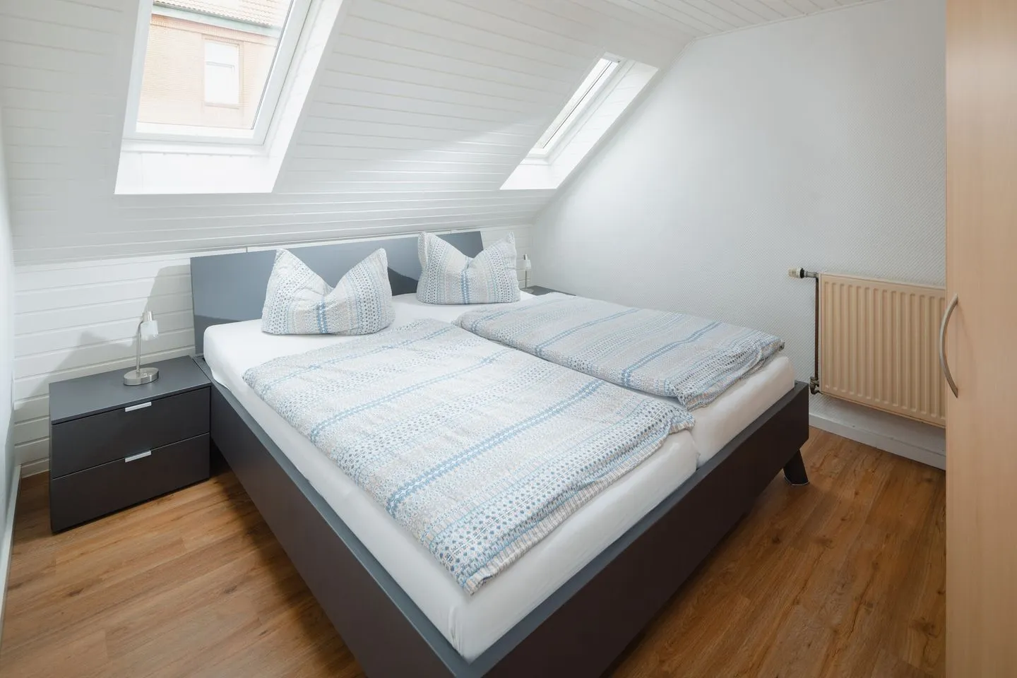 Die „Alte Schmiede“ bietet mit ihrer über 60 qm großen Wohnung Nummer 6 sehr großzügige Räumlichkeiten. Bis zu vier Personen genießen hier ein ausgesprochenes Wohlfühl-Ambiente, zu dem auch der sehr große Balkon beiträgt. Dieser ist natürlich durch den Wohnbereich zu erreichen, aber auch separat durch das zweite Schlafzimmer. Küche und Wohnbereich sind in der Wohnung 6 in einem Bereich, allerdings räumlich distanziert, arrangiert. So bleibt man in Verbindung, und doch wirkt jeder Funktionsbereich eigenständig. Das Bad verfügt über Dusche und WC. Die komplette Ausstattung aller Zimmer sei hier nur der Vollständigkeit halber erwähnt.
