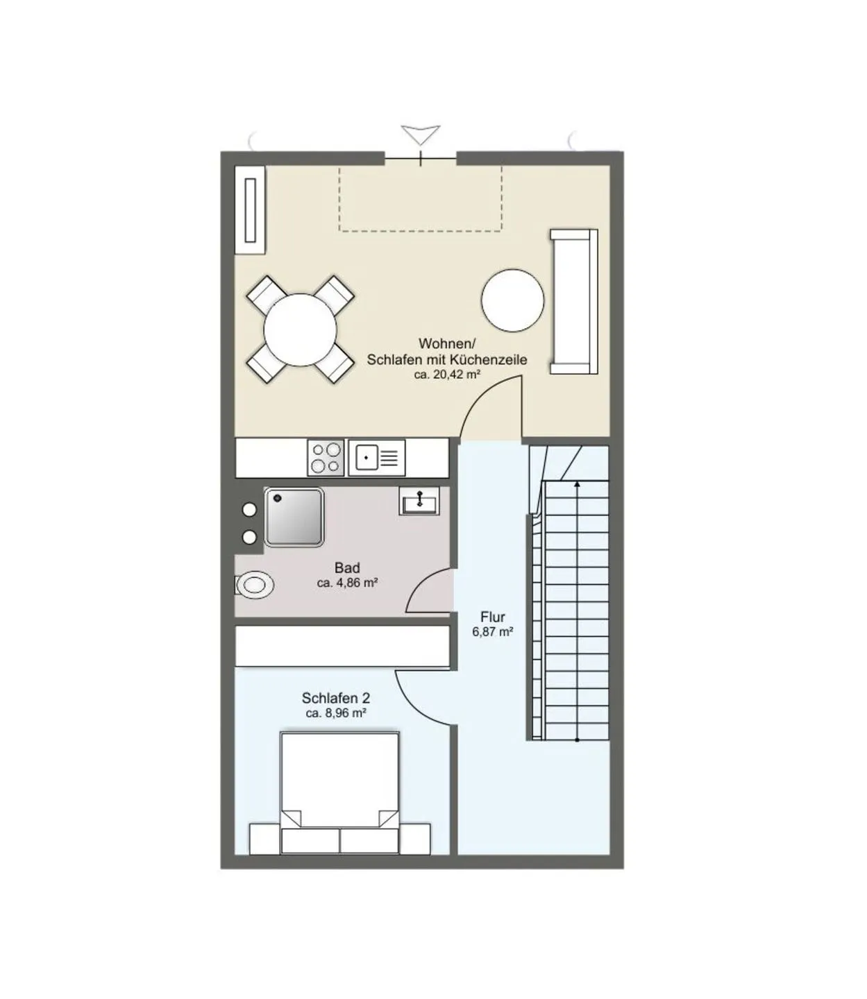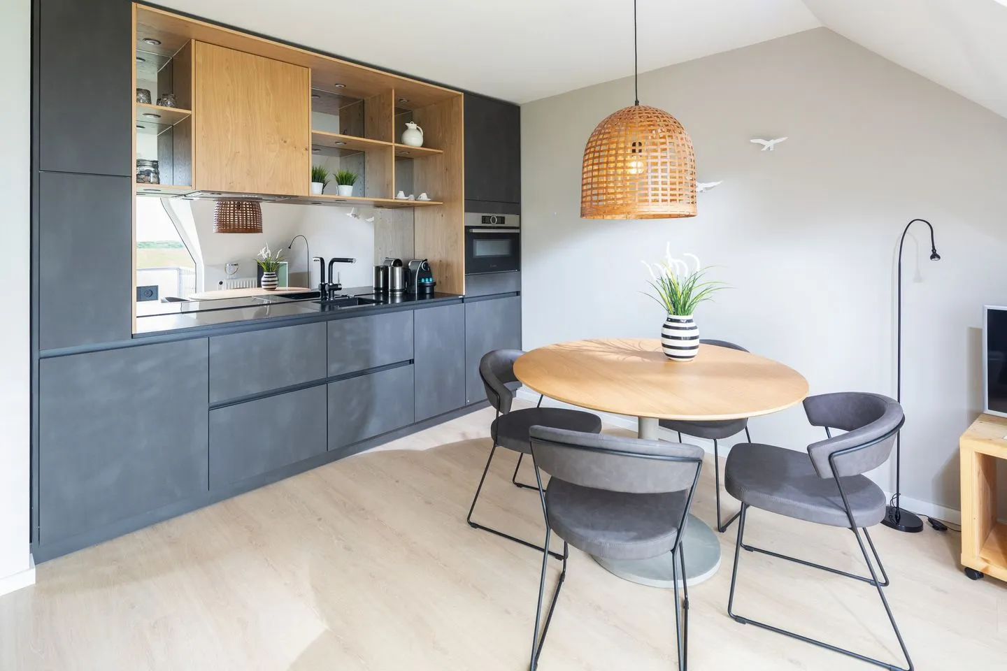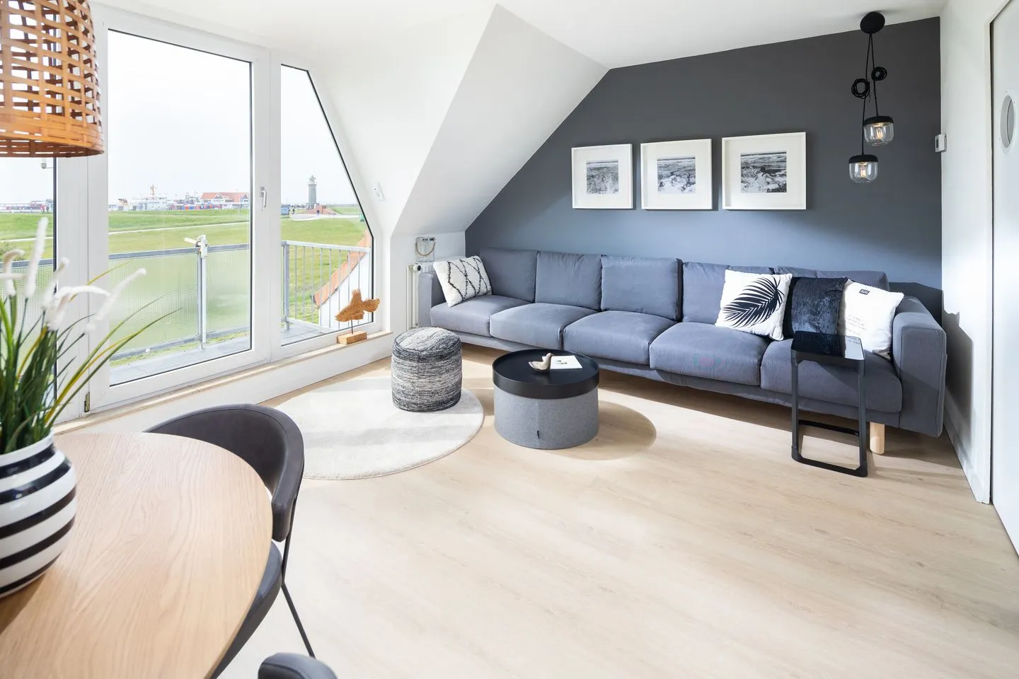 Auf zwei Ebenen in dezenten Farben abgestimmt, finden Sie zwei Schlafzimmer, ein Duschbad und eine moderne Wohnküche mit einem Sofa für die ganze Familie. Die neue Küche ist hochwertig ausgestattet, und der Balkon mit dem Blick zum Hafen, Salzwiesen und Leuchtturm ist der ideale Rückzugsort, um zu entspannen.