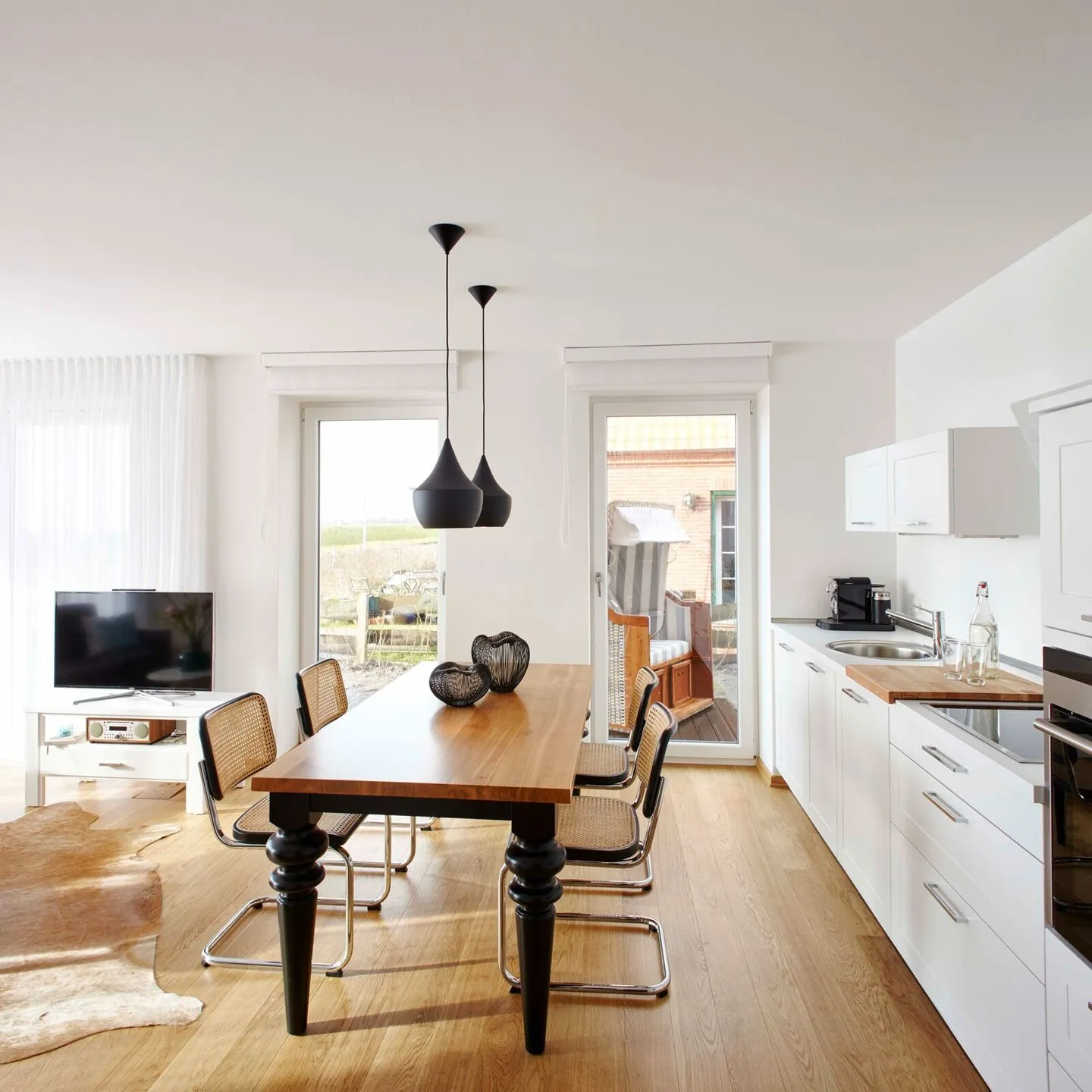 Miss Evans bietet Ihnen auf ca. 70 m2 viel Raum für Erholung und Entspannung auf Juist. Das Markenzeichen der Wohnungen ist das moderne Design mit persönlicher Note. Zur Ausstattung der Wohnung gehören zwei Schlafzimmer, ein Badezimmer und ein Wohnzimmer mit offener Wohnküche für gemeinsame Momente auf der gemütlichen Couch oder in der Essecke. Die Küche ist vollausgestattet mit Induktions-Kochfeld, Backofen und Mikrowelle. Die Nespressomaschine zaubert Ihnen morgens - zwar nicht George Clooney herbei, aber einen hervorragenden Cappuccino. Im Wohnzimmer befinden sich zwei Sofas, ein Fernseher, ein DVD-Player, eine Spiele-Konsole, eine Musikanlage und eine iPod-Dockingstation. Im Master-Bedroom sorgt ein großes Doppelbett für einen gesunden Schlaf. Auch DVD-Player und Fernseher sind hier integriert.
