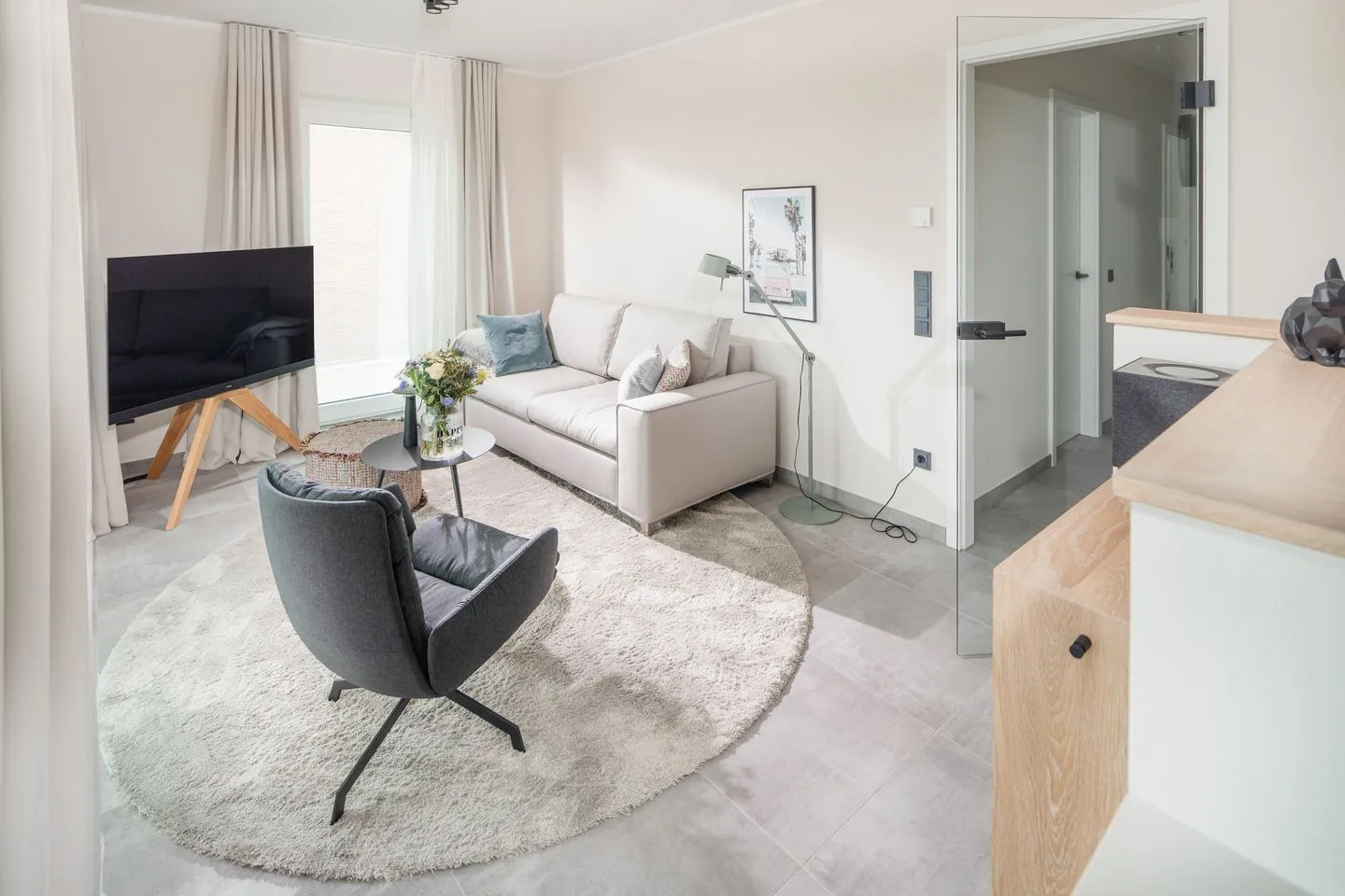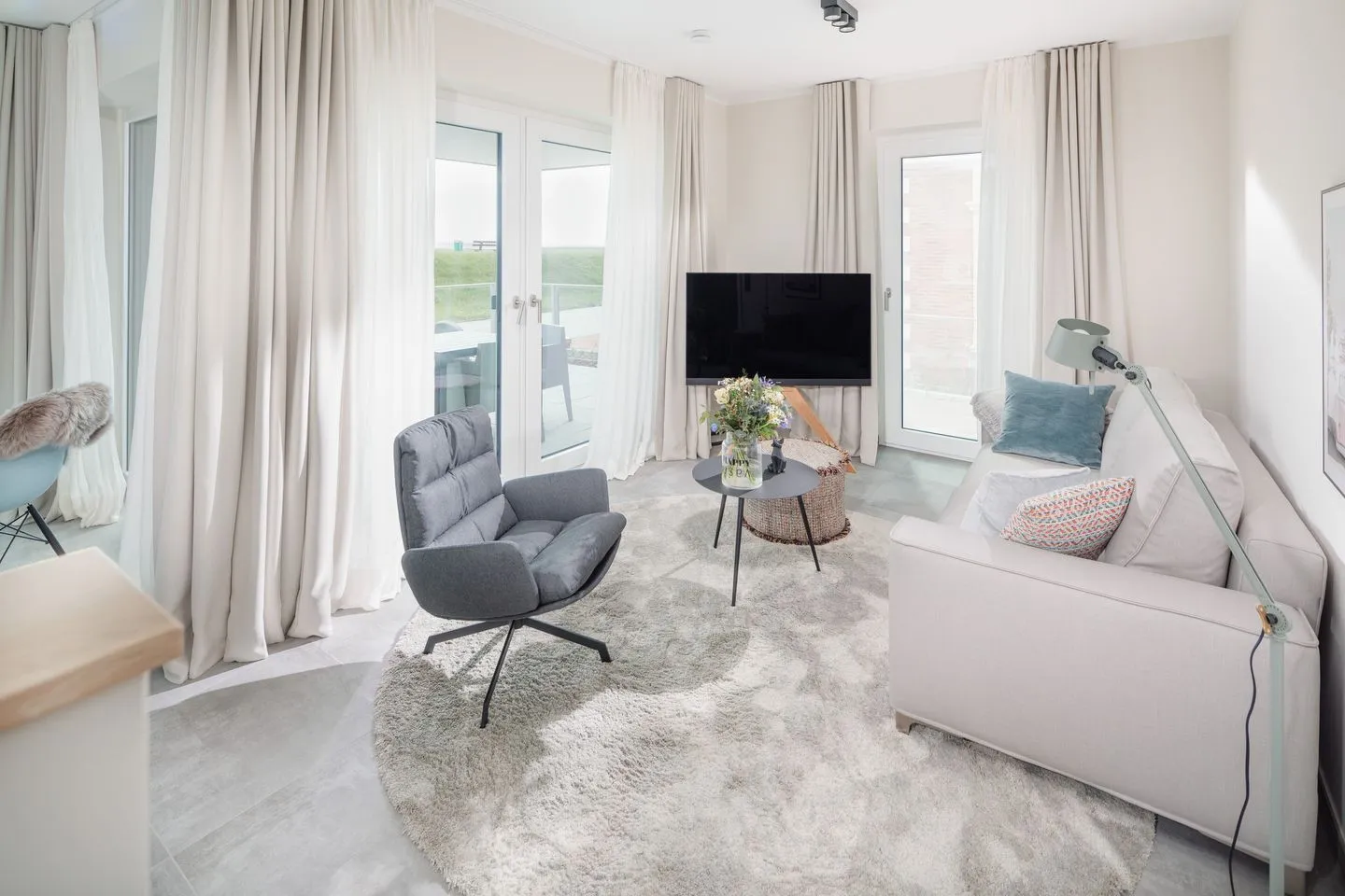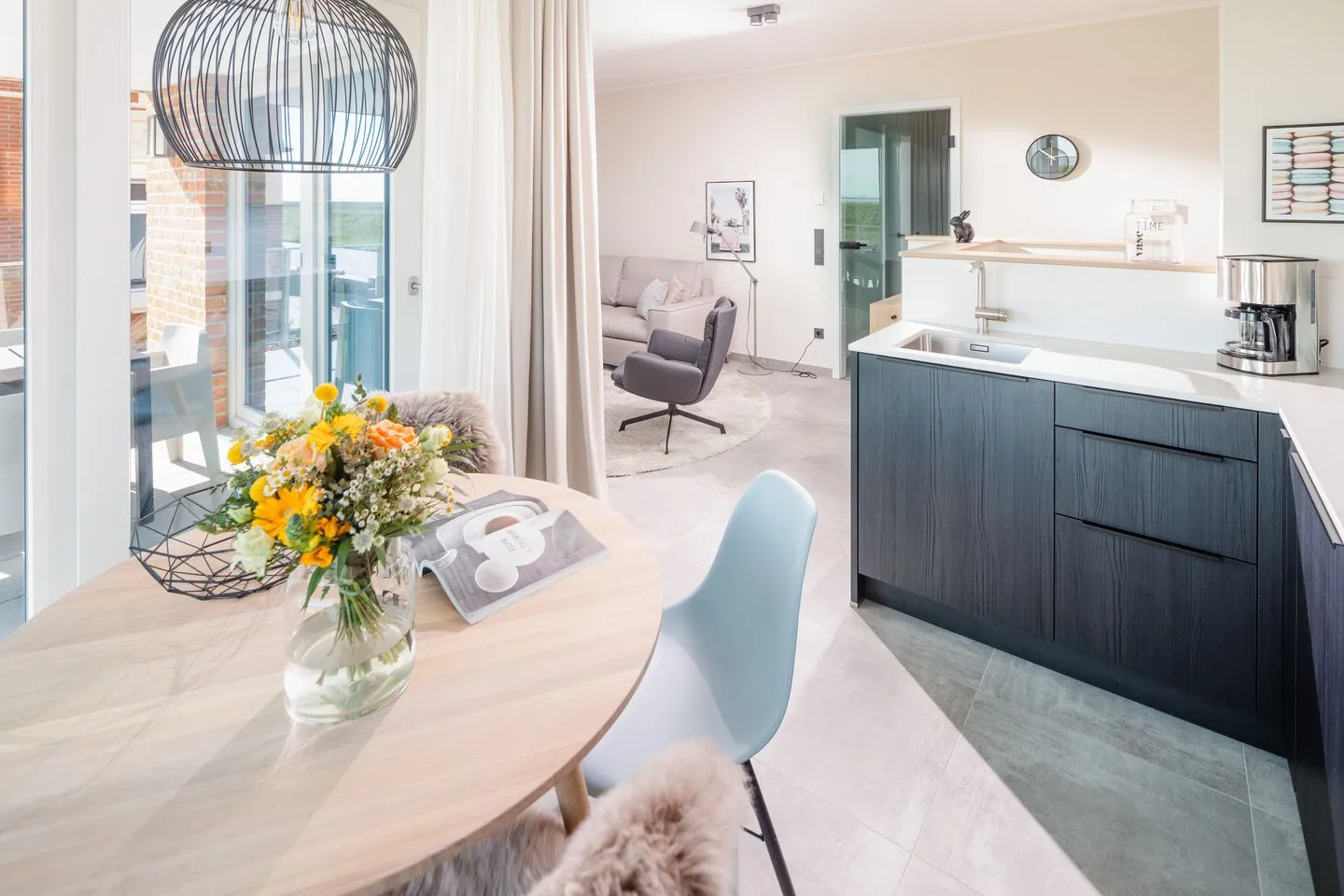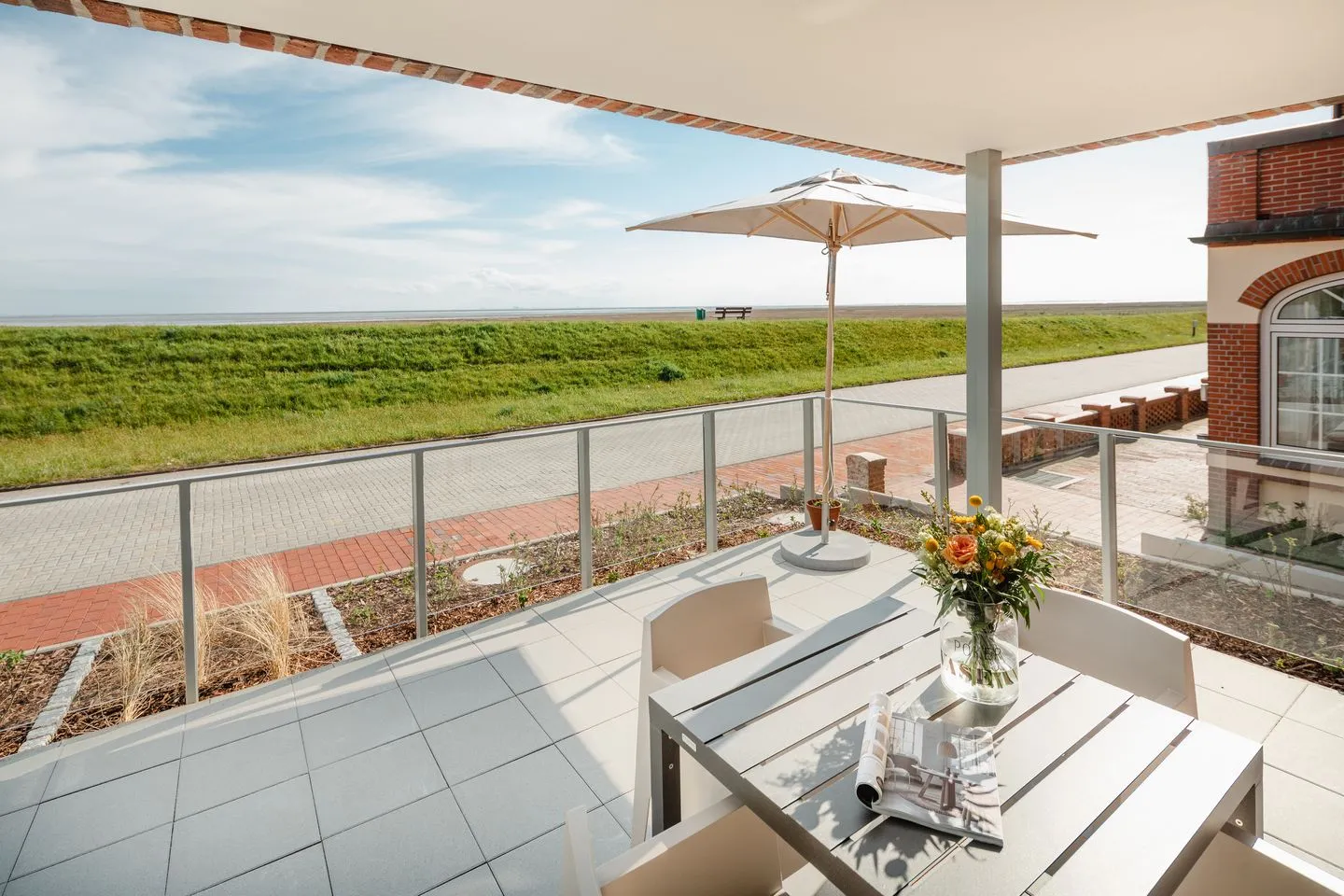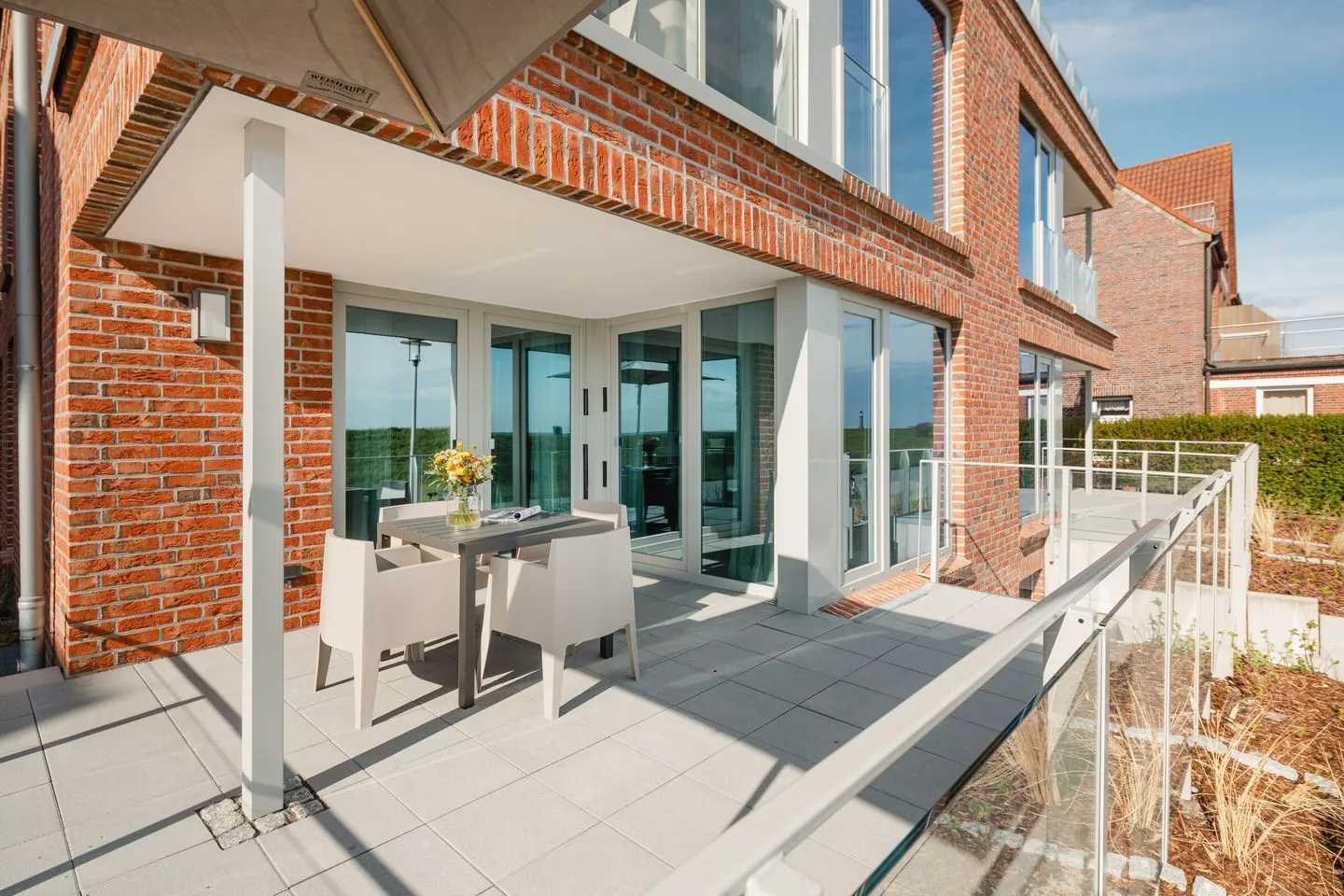 Über zwei Ebenen auf insgesamt 99 qm erstreckt sich diese einzigartige Wohneinheit, die ein Höchstmaß an Komfort bietet und beim Eintreten den Blick Richtung Süden lenkt. Das Erdgeschoss verfügt über einen Koch-/Wohnbereich mit direktem Zugang zur Terrasse. Bodentiefe Fenster sorgen für ein lichtdurchflutetes Ambiente. Die wunderschönen Details dieser Ferienwohnung mit ihrer hochwertigen Ausstattung werden sie begeistern. Neben zwei Schlafzimmern mit Doppelbetten und zwei Duschbädern gehören eine Infrarot-Sauna und ein ausgefallener, kleiner Fitnessraum zur gehobenen Ausstattung.