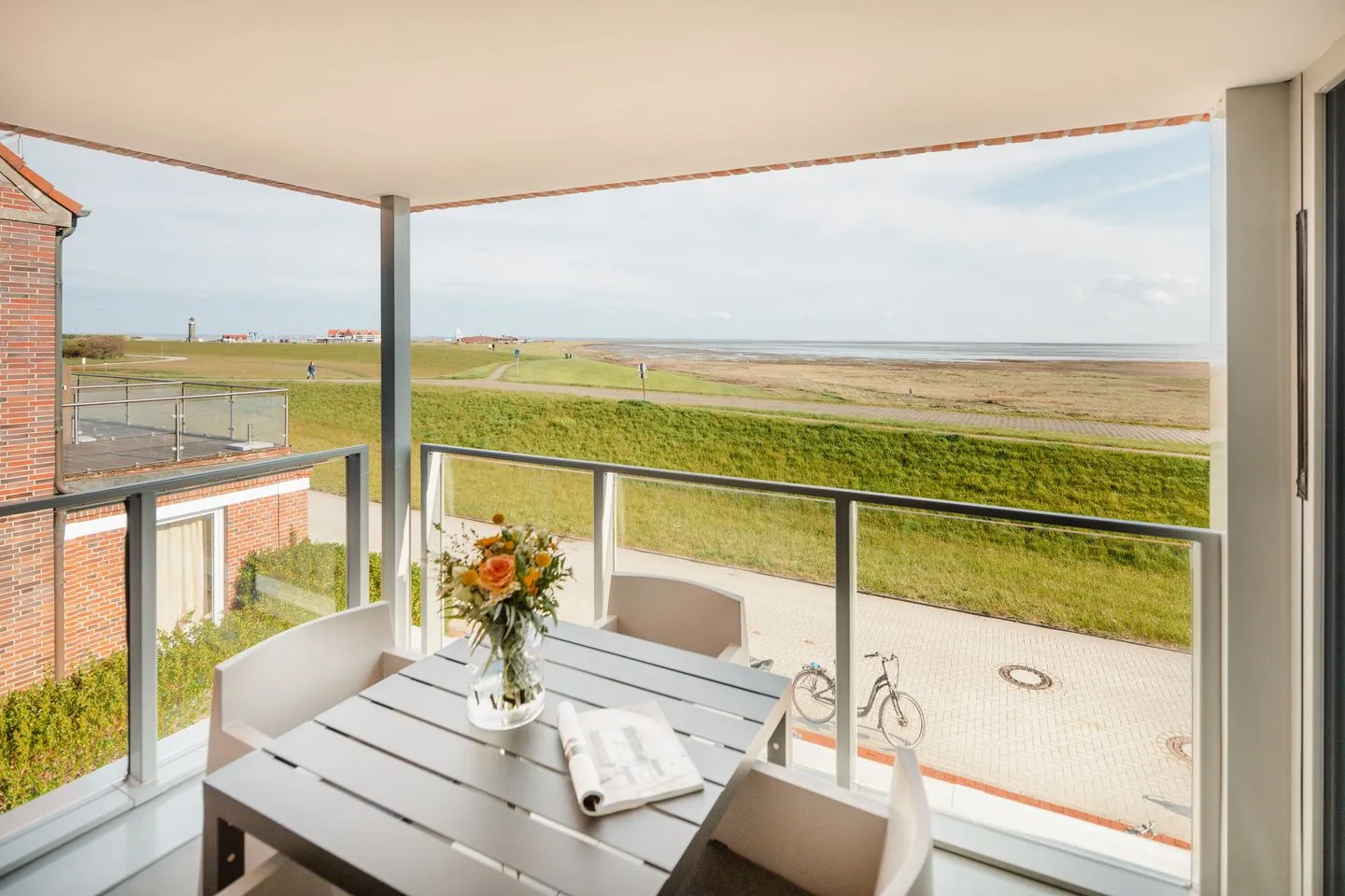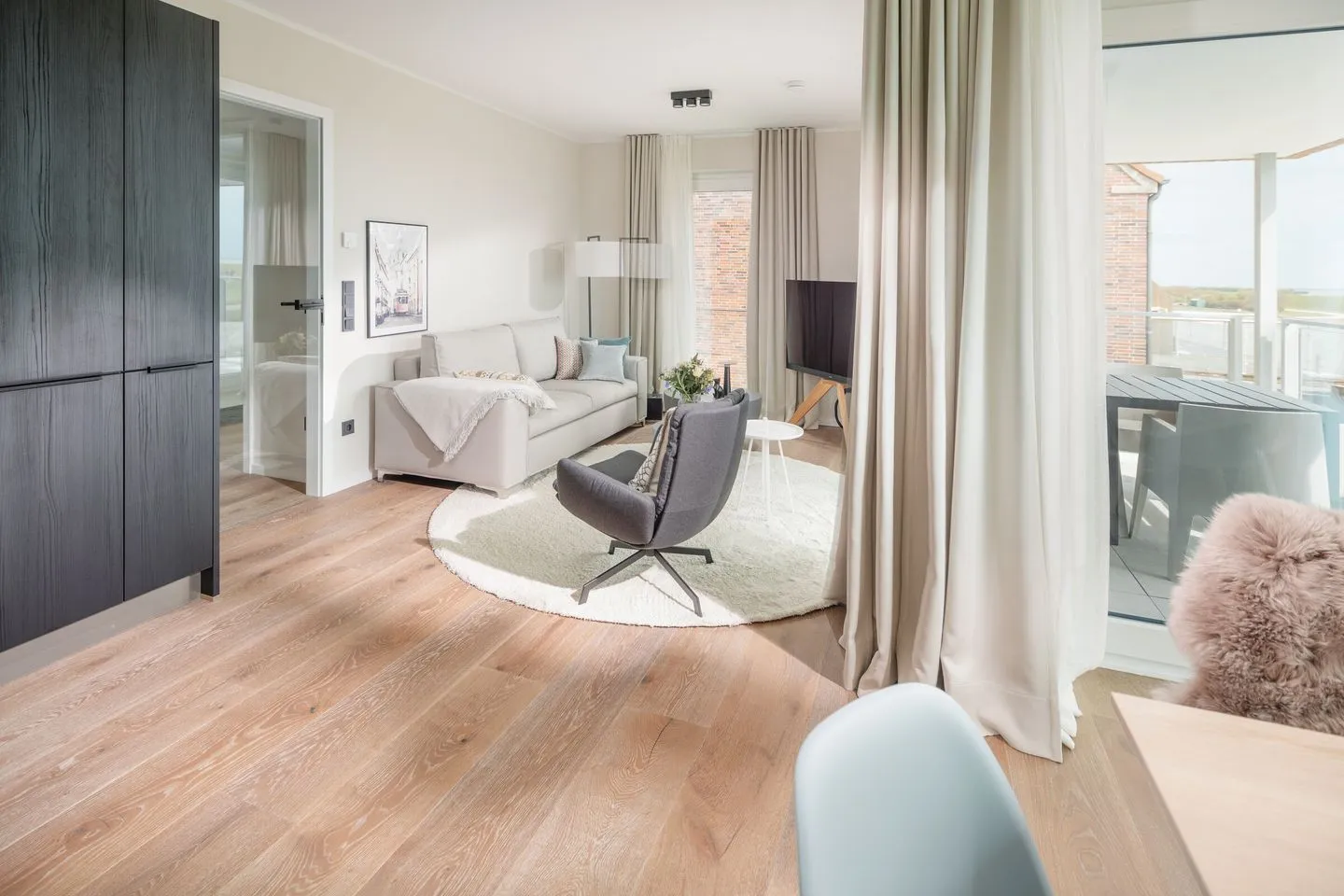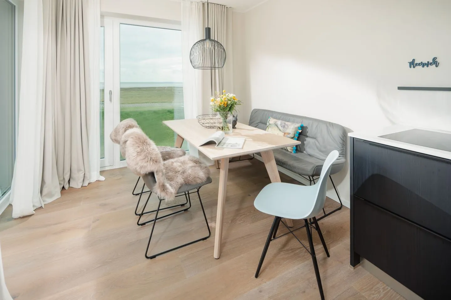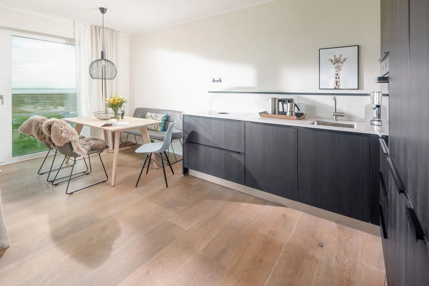 Beim Betreten dieser modernen, 60 qm Zweizimmerwohnung erwartet Sie beim Eintreten ein spektakulärer Blick auf und über den Deich, die malerischen Salzwiesen und das Meer. Dieses Feriendomizil ist die perfekte Wohnung zu zweit. Sie punktet mit ihrer hochwertigen Gestaltung und Ausstattung. Die gesamte Wohnung ist mit Massivholzdielen ausgestattet und sorgt so, in Verbindung mit der Möblierung, für ein äußerst gemütliches Ambiente. Große, bodentiefe Fenster fluten diese Wohnung mit fantastischem Licht, ein Südbalkon bietet Panorama und Erholung pur.